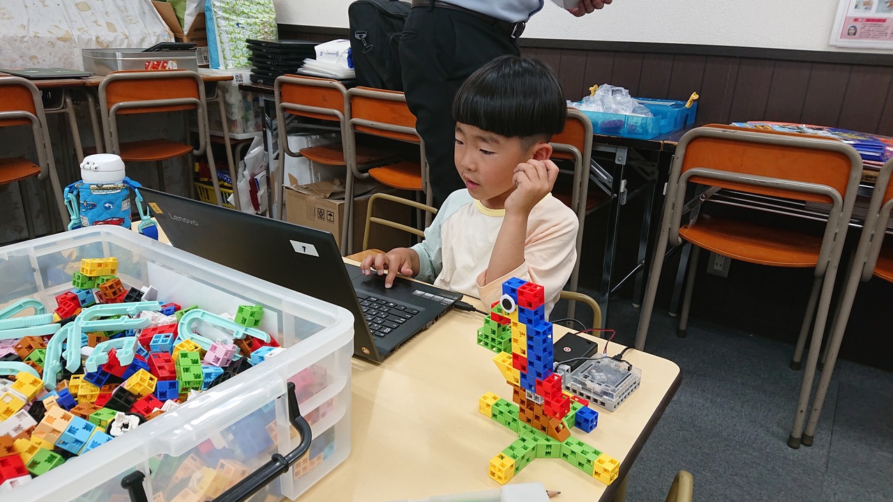 小学1・2年生対象のベーシックコース。テーマは「モーターを使ったプログラミングロボット」。パソコンの基本動作やプログラミングに必要な考え方を実際に操作しながら学ぼう!!